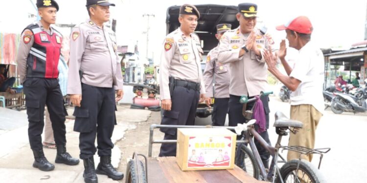 LHOKSEUMAWE – Polres Lhokseumawe menyalurkan bantuan sosial (bansos) kepada tukang becak di wilayah hukum Polres Lhokseumawe, selasa (28/03/2023).