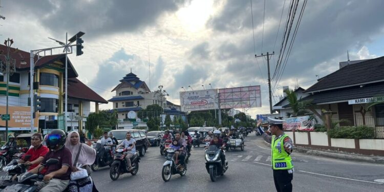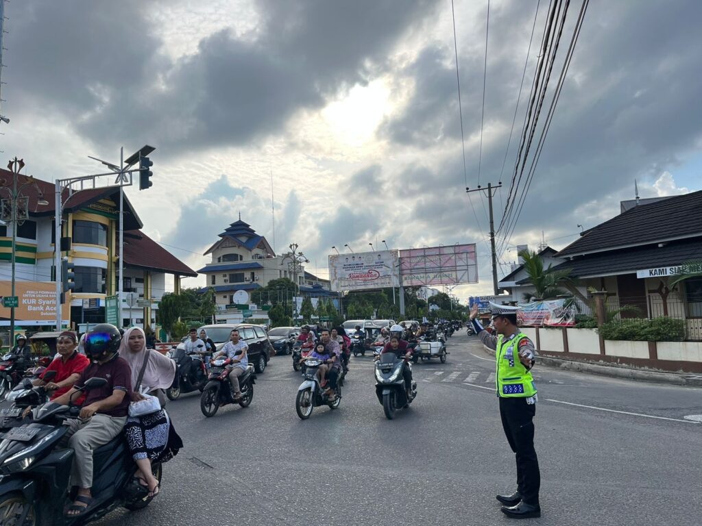LHOKSEUMAWE – Aktivitas masyarakat di sore hari menjelang waktu berbuka puasa padat, Polantas Lhokseumawe siaga di sejumlah titik di wilayah Kota Lhokseumawe dan mengatur arus lalu lintas guna mencegah kemacetan, Selasa (4/4/2023).