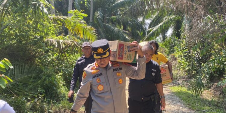 Aceh Utara — Kapolres Lhokseumawe, AKBP Dr. Ahzan, S.H., S.I.K., M.S.M., M.H., turun langsung menyerahkan bantuan sembako kepada masyarakat yang terdampak banjir di Desa Ulee Blang, Kecamatan Nisam, Kabupaten Aceh Utara, Provinsi Aceh., Senin (1/12/2025) sekitar pukul 10.30 WIB.