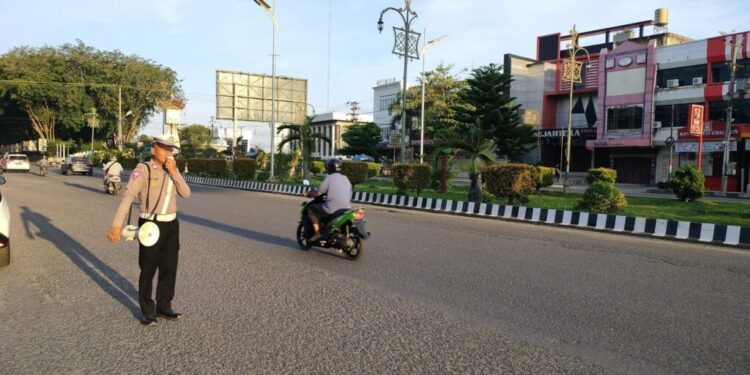 Lhokseumawe – Unit Kamsel Satlantas Polres Lhokseumawe menggelar kegiatan penyuluhan keliling (meupep-pep) di Jl. Merdeka, tepatnya di depan Masjid Islamic Center Kota Lhokseumawe, Selasa pagi, selasa (21/1/2024) pagi.