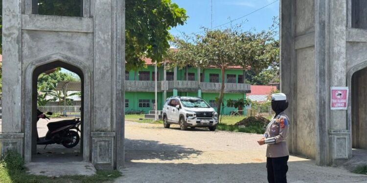 Lhokseumawe – Sejumlah Polisi Wanita (Polwan) dari Satlantas Polres Lhokseumawe melaksanakan kegiatan patroli dan pengamanan (strong point) menjelang pelaksanaan Sholat Jumat di seputaran Kota Lhokseumawe, Jumat siang (18/7/2025).