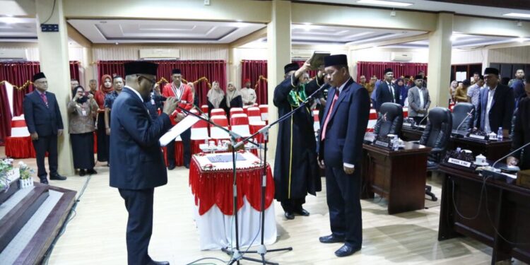 LHOKSEUMAWE – Ketua Dewan Perwakilan Rakyat Kota (DPRK) Lhokseumawe Murhaban, secara resmi melantik dan meresmikan pengangkatan Antar Waktu (PAW) atas nama Abdullah Anggota DPRK Lhokseumawe sisa masa jabatan 2019-2024 yang berlangsung di ruang sidang DPRK, Senin (29/01/2024).