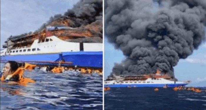 Kapal Motor Barcelona VA terbakar di perairan Pulau Talise, Minahasa Utara, Sulawesi Utara, Minggu (20/7/2025) siang. Api diduga berasal dari salah satu kamar penumpang.