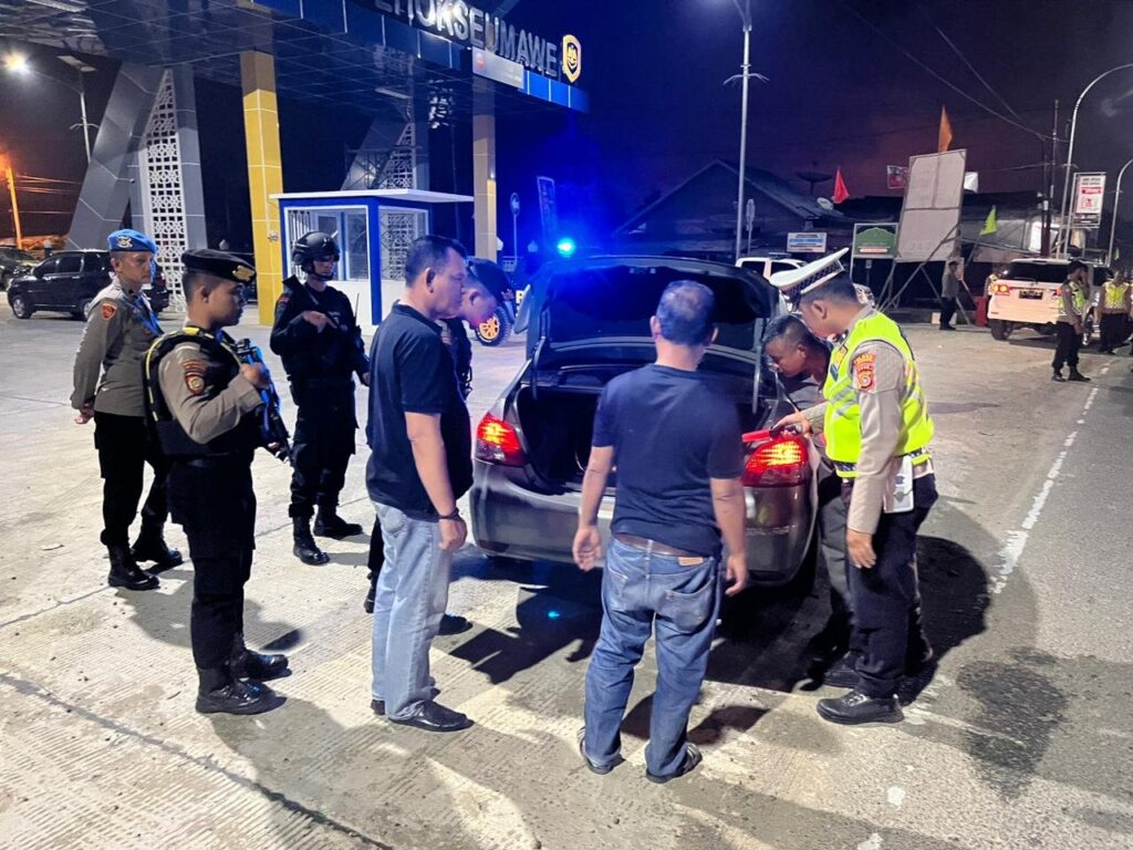 LHOKSEUMAWE – Personel Polres Lhokseumawe menggelar razia di jalan lintas Medan – Banda Aceh di depan terminal bus, Desa Meunasah Mee, Kandang, Kecamatan Muara Dua, Kota Lhokseumawe, Sabtu (3/2/2024) malam.
