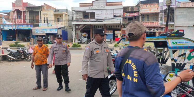 LHOKSEUMAWE – Personel Polsek Muara Satu melakukan patroli dengan berjalan kaki di kawasan pasar Batuphat, Kecamatan Muara Satu, Kota Lhokseumawe, Kamis (2/11/2023).