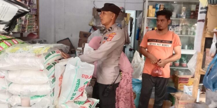 LHOKSEUMAWE – Personel Polsek Simpang Keuramat, Polres Lhokseumawe kembali memantau stok sembako ke sejumlah pedagang di pasar Keude Simpang Empat, Simpang Keuramat, Aceh Utara, Selasa (16/5/2023).
