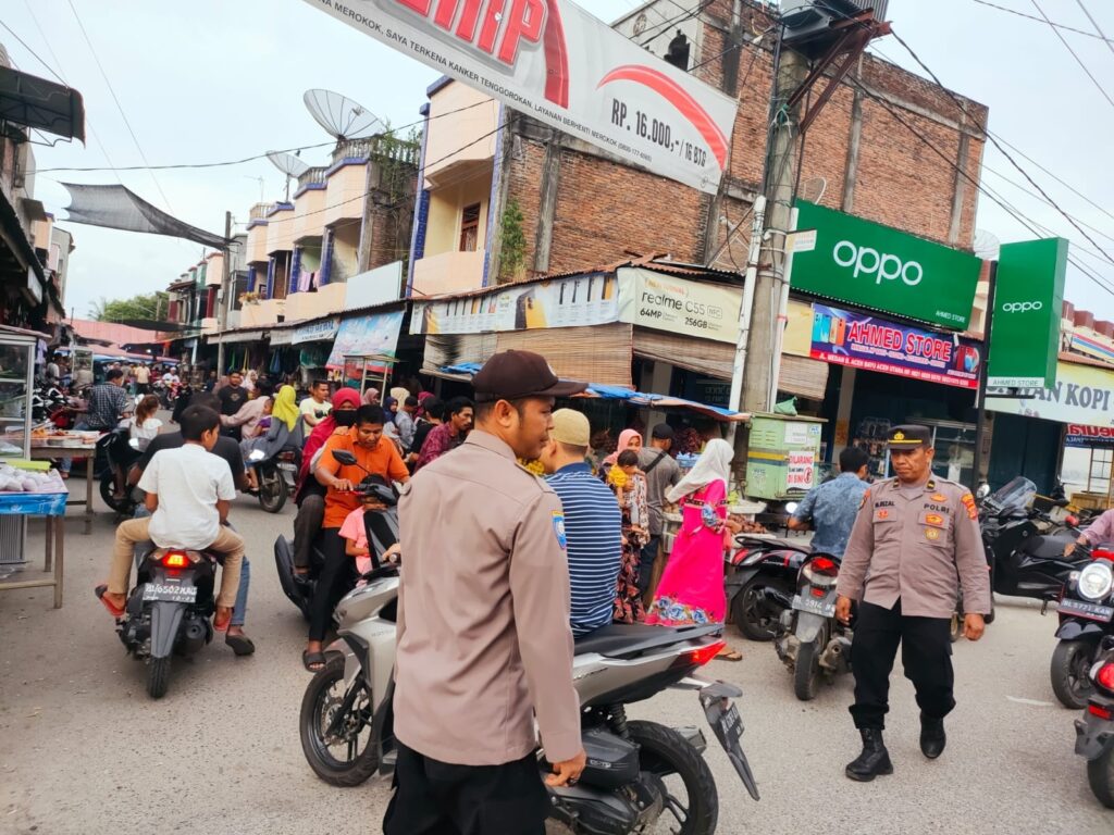 LHOKSEUMAWE – Polsek Syamtalira Bayu melakukan pengamanan dan pengaturan lalu lintas di kawasan Keude Bayu, Syamtalira Bayu, Aceh Utara, wilayah hukum Polres Lhokseumawe menjelang waktu berbuka puasa, Kamis (23/3/2023) sore.