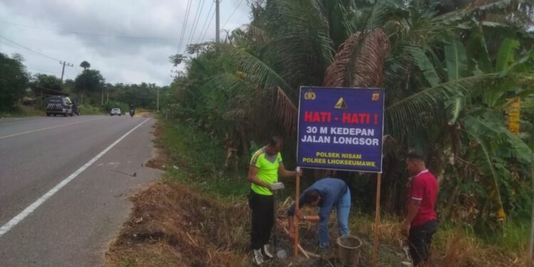 LHOKSEUMAWE – Personel Polsek Nisam memasang pamplet himbauan rawan longsor tepatnya di jalan Elak kawasan Blang Karieng, Kecamatan Nisam, Aceh Utara, wilayah hukum Polres Lhokseumawe, Kamis (20/4/2023).
