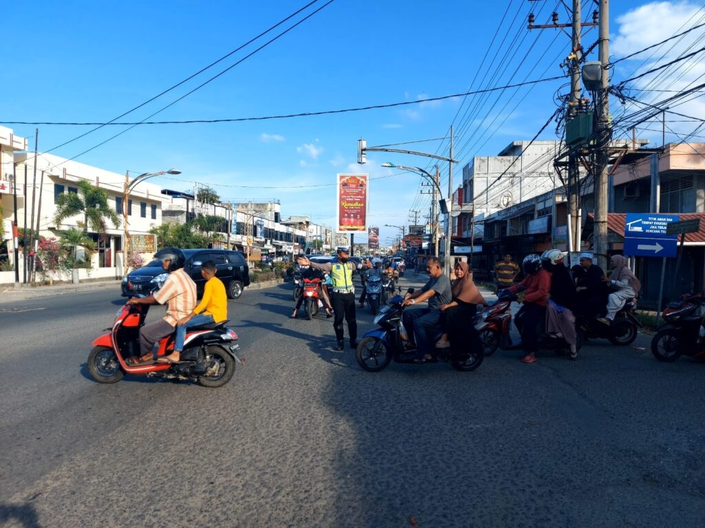 LHOKSEUMAWE – Polantas Lhokseumawe mengatur arus lalu lintas di titik penggal di kawasan Kota Lhokseumawe menjelang waktu berbuka puasa, Kamis (30/3/2023) sore, kegiatan tersebut guna mengantisipasi kemacetan.
