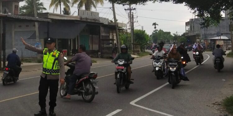 ACEH UTARA, Dalam upaya mengurangi kemacetan pada jam jam sibuk di kawasan zona Sekolah Personel Polsek Syamtalira Bayu Polres Lhokseumawe Polda Aceh melaksanakan pengaturan di jalan Medan-B. Aceh simpang Cot Plieng khususnya seputaran depan Sekolah kecamatan Syamtalira Bayu 15/10/2024).pagi.