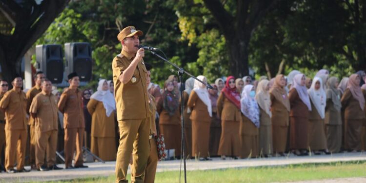 Lhokseumawe – Wali Kota Lhokseumawe, Dr. Sayuti Abubakar, bersama Wakil Wali Kota Husaini, SE menyelenggarakan apel perdana di lingkungan Pemerintah Kota Lhokseumawe pada hari Senin, 08/04/2025.