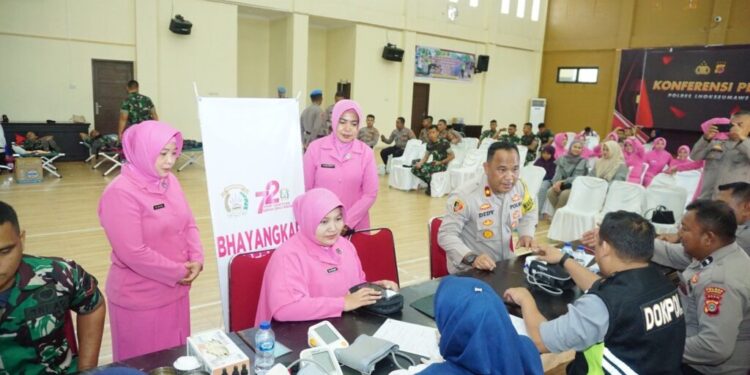 LHOKSEUMAWE – Polres Lhokseumawe menggelar donor darah dalam rangka Bakti Kesehatan Hari Bhayangkara ke 78, kegiatan tersebut tersebut berlangsung di gedung serbaguna Mapolres Lhokseumawe, Selasa (25/6/2024).
