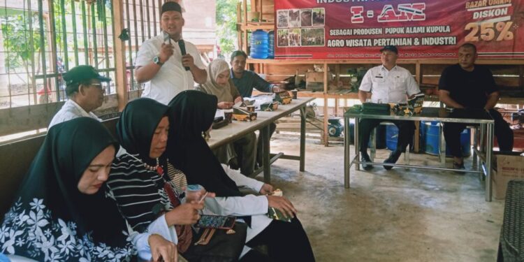 LHOKSEUMAWE – Bang Azhari memberikan materi pada kegiatan sosialisasi marketing digital di kawasan Industri Aceh Millenium (I-AM) agro wisata pertanian dan industri di Paloh Dayah, Kecamatan Muara Satu, Kota Lhokseumawe, Rabu (11/10/2023).