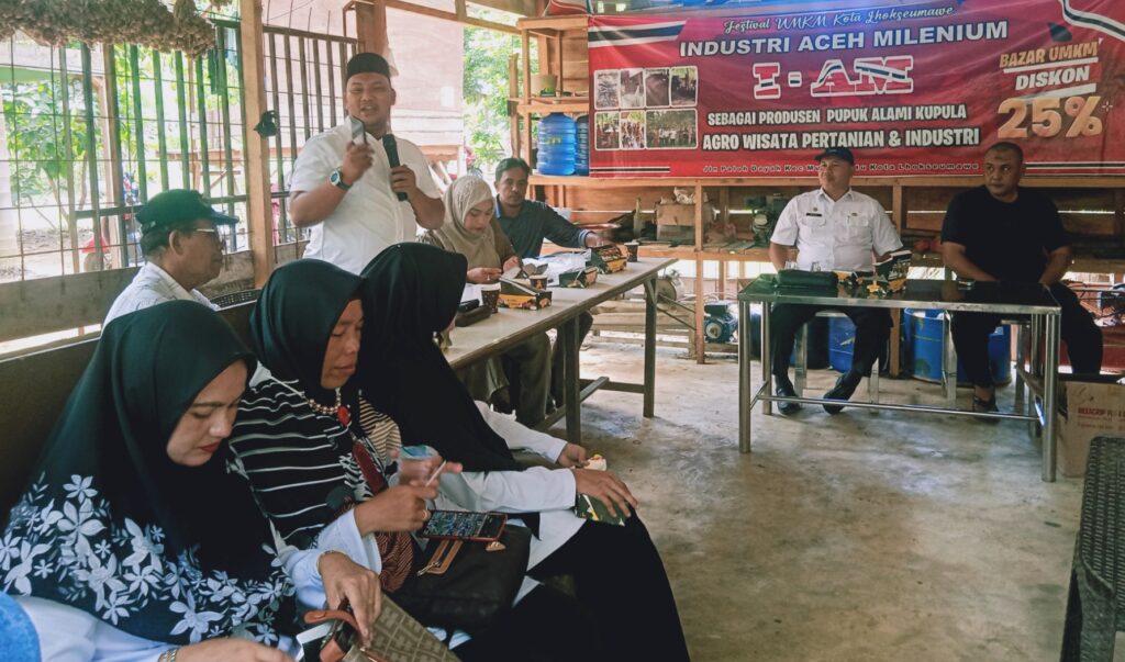 LHOKSEUMAWE – Bang Azhari memberikan materi pada kegiatan sosialisasi marketing digital di kawasan Industri Aceh Millenium (I-AM) agro wisata pertanian dan industri di Paloh Dayah, Kecamatan Muara Satu, Kota Lhokseumawe, Rabu (11/10/2023).