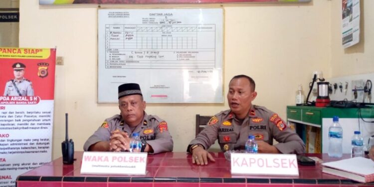 LHOKSEUMAWE – Baru menjabat sebagai Kapolsek Banda Sakti, Ipda Arizal langsung memimpin rapat di Mako Polsek Banda Sakti, Polres Lhokseumawe, Kamis (15/6/2023).