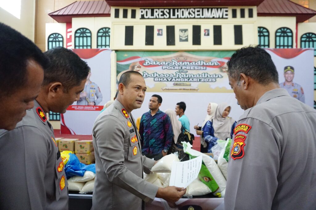 Lhokseumawe – Antusiasme masyarakat begitu tinggi dalam kegiatan Bazar Ramadhan Polri Presisi yang digelar Polres Lhokseumawe di gedung serbaguna Wirasatya Mapolres Lhokseumawe. Dalam waktu singkat, 300 paket sembako yang disediakan langsung habis dibeli oleh warga yang hadir di lingkungan Mapolres, Rabu (20/3/2025) sore.