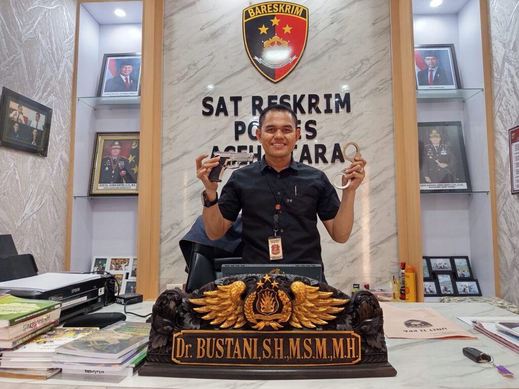 “Tersangka IKN kita tangkap di tempat persembunyiannya di kawasan Karang Baru, Aceh Tamiang, Senin, 2 Juni 2025 lalu. Proses penangkapan cukup berliku, karena tersangka terus berpindah-pindah tempat. Turut kita amankan sepucuk senjata jenis airsoft gun dan sepasang borgol yang digunakan untuk memperlancar aksinya. Selama beraksi, tersangka ini tidak memakai seragam atau menunjukkan Kartu Tanda Anggota (KTA), tapi lebih bertindak sebagai Intelijen,” ujar Bustani.