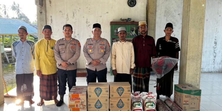 ACEH Utara – Polres Lhokseumawe berikan bantuan sembako, tikar plastik, dispenser, beras, dan kipas angin di Dayah Shirathul Huda, yang diterima oleh Pimpinan Tgk Ishak Daud di Desa Babah Krueng, Kecamatan Sawang, rabu (13/3/2024) sore.