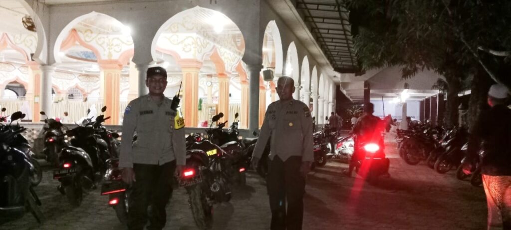 LHOKSEUMAWE – Personel Polsek Nisam melaksanakan pengamanan pelaksanaan ibadah shalat tarawih di Masjid Al Aqsa Gampong Meunasah Meucat, Kecamatan Nisam, Aceh Utara, wilayah hukum Polres Lhokseumawe, Senin (27/3/2023) malam.