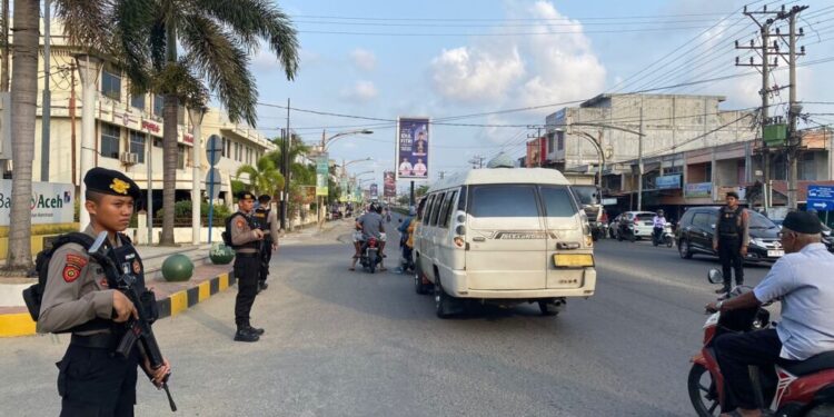LHOKSEUMAWE – Tim Unit Reaksi Cepat (URC) Sat Samapta Polres Lhokseumawe melaksanakan pengamanan dan strong poin di sejumlah titik persimpangan di wilayah Kota Lhokseumawe, Senin (17/4/2023) sore.