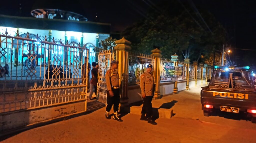 LHOKSEUMAWE – Personel Polsek Muara Dua, Polres Lhokseumawe menyiagakan personel di sejumlah masjid, kegiatan ini dalam rangka pengamanan pelaksanaan ibadah shalat Isya dan tarawih malam pertama Ramadhan, Kamis (22/3/2023) malam.