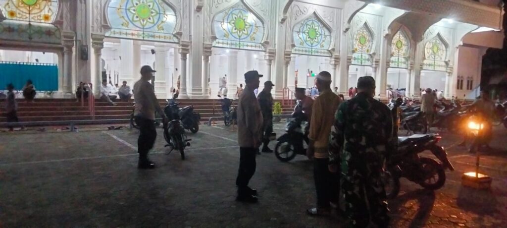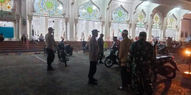 LHOKSEUMAWE – Personel Polsek Muara Dua bersama TNI melakukan pengamanan ibadah shalat tarawih di sejumlah masjid di kawasan Muara Dua, Kota Lhokseumawe, Minggu (2/4/2023) malam, kegiatan tersebut guna memberi rasa nyaman kepada jemaah.