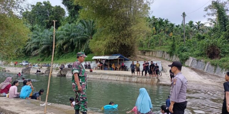 LHOKSEUMAWE – Personel Polsek Kuta Makmur, Polres Lhokseumawe bersinergi dengan TNI untuk mewujudkan kenyamanan kepada pengunjung di sejumlah obyek wisata selama libur lebaran, Minggu (30/4/2023).