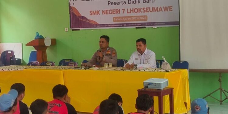 Lhokseumawe – Dalam rangka Masa Pengenalan Lingkungan Sekolah (MPLS) bagi peserta didik baru, Bhabinkamtibmas Polsek Muara Satu, Bripka Ramli memberikan sosialisasi kamtibmas di SMK Negeri 7 Lhokseumawe, Desa Blang Panyang, Kecamatan Muara Satu, Rabu pagi (17/7/2025).