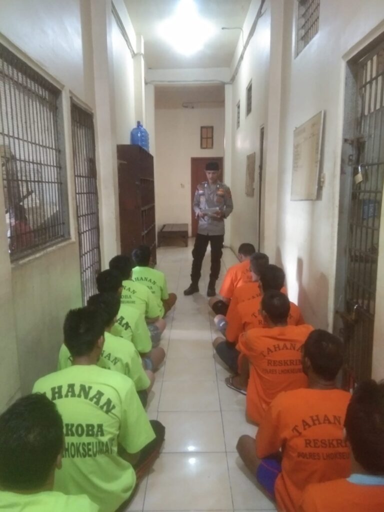 LHOKSEUMAWE – Personel Sat Tahti Polres Lhokseumawe memberikan bimbingan rohani dan mental (Binrohtal) kepada para tahanan di rutan Mapolres Lhokseumawe, dalam kegiatan ini personel meminta para tahanan agar menjaga shalat lima waktu, Jumat (9/2/2024).