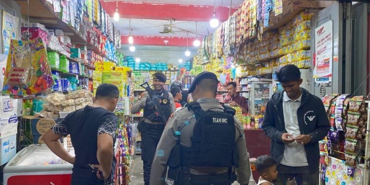 LHOKSEUMAWE – Tim Unit Reaksi Cepat (URC) Sat Samapta Polres Lhokseumawe memantau aktivitas pedagang dan menyasar titik rawan pada saat melaksanakan blue light patrol di seputaran wilayah hukum Polres Lhokseumawe, Rabu (8/2/2023) malam.