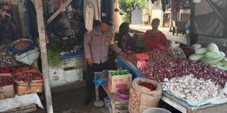 LHOKSEUMAWE – Personel Polsek Meurah Mulia, Polres Lhokseumawe blusukan ke pasar Jungka Gajah, Meurah Mulia, Aceh Utara, Jumat (26/5/2023), kegiatan tersebut untuk mengecek persediaan sembako.