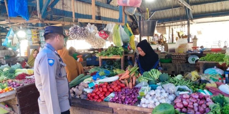 LHOKSEUMAWE – Personel Polsek Syamtalira Bayu blusukan ke pasar tradisional di kecamatan Syamtalira Bayu, Aceh Utara, wilayah hukum Polres Lhokseumawe, kegiatan ini sebagai upaya Kepolisian menjaga stabilitas stok sembako, Selasa (23/5/2023).