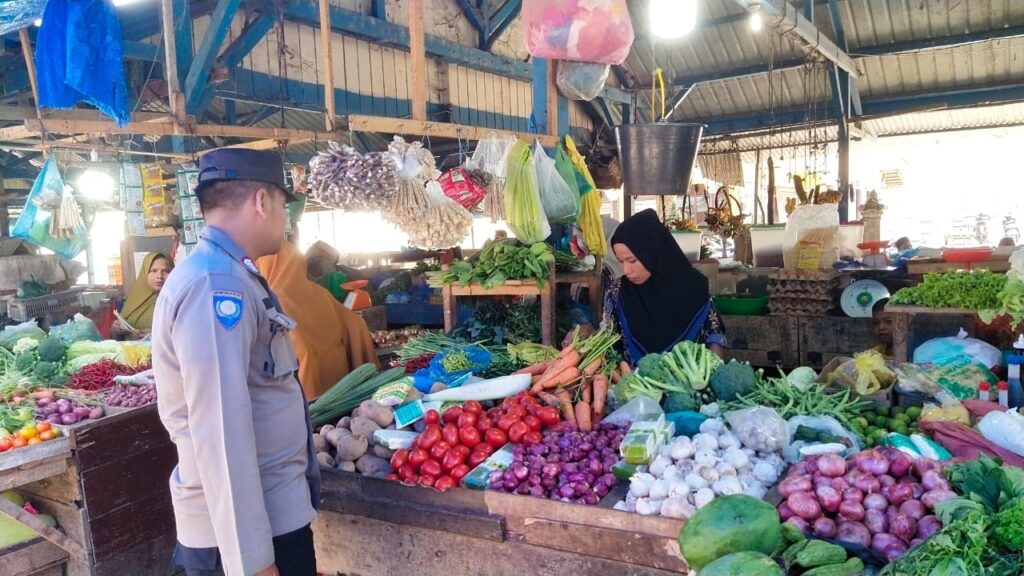 LHOKSEUMAWE – Personel Polsek Syamtalira Bayu blusukan ke pasar tradisional di kecamatan Syamtalira Bayu, Aceh Utara, wilayah hukum Polres Lhokseumawe, kegiatan ini sebagai upaya Kepolisian menjaga stabilitas stok sembako, Selasa (23/5/2023).
