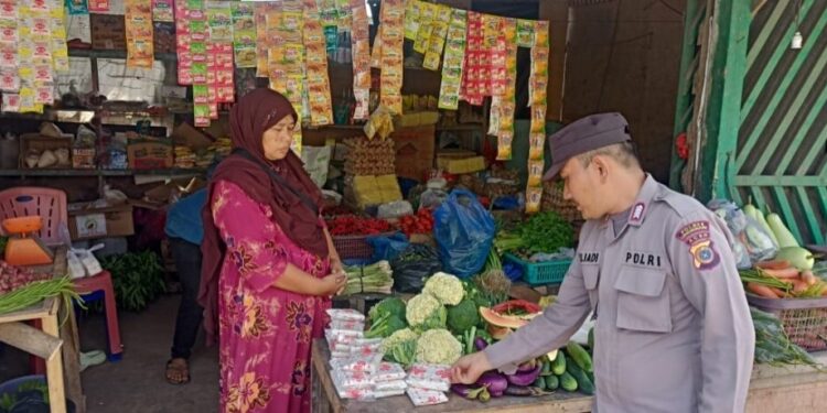 LHOKSEUMAWE – Personel Polsek Dewantara blusukan ke pasar Keude Krueng Geukueh, Kecamatan Dewantara, Aceh Utara, wilayah hukum Polres Lhokseumawe, Sabtu (4/3/2023), kegiatan tersebut sebagai upaya Kepolisian menjaga stabilitas stok sembako menjelang bulan suci Ramadhan.