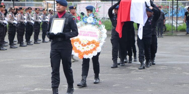 Jayapura – Jenazah personel Brimob Ops Damai Cartenz yang menjadi korban dalam kontak tembak dengan Kelompok Kriminal Bersenjata (KKB), Briptu Rudi Agung Ashari, diberangkatkan ke kampung halamannya, Manado. Upacara pemberangkatan pun dilaksanakan dengan dipimpin Wakapolda Papua Brigjen. Pol. Ramdani Hidayat.