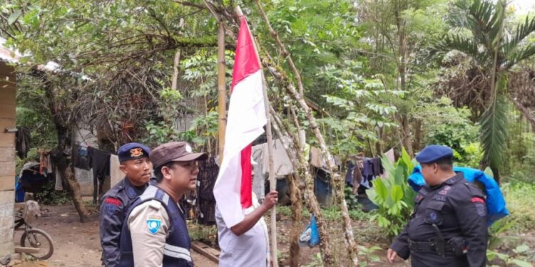 Selain bantuan sosial para personil Brimob juga melakukan pemasangan bendera di sejumlah rumah warga yang belum ada terpasang nya bendera merah putih