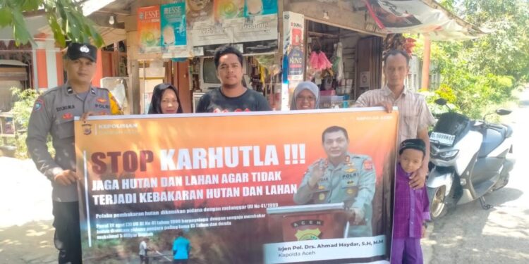 LHOKSEUMAWE – Personel Polsek Muara Dua memasang spanduk dan makumat kapolda Aceh tentang pencegahan kebakaran hutan dan lahan (Karhutla) di lokasi public di Kecamatan Muara Dua, Kota Lhokseumawe,Kamis (27/7/2023).