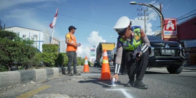 LHOKSEUMAWE – Polantas Lhokseumawe memberi tanda pada titik jalan yang rusak di wilayah hukum Polres Lhokseumawe, hal ini guna mencegah kecelakaan lalu lintas dan memberi kenyamanan kepada pengendara, Rabu (23/8/2023).