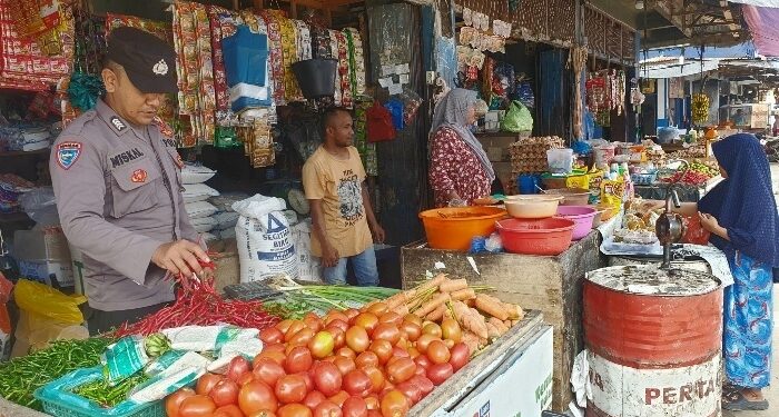 LHOKSEUMAWE – Cegah kelangkaan barang sembako selama bulan suci Ramadhan 1444 Hijriah, Personel Polsek Syamtalira Bayu menyambagi pedagang di pasar tradisional dan toko kelontong di Kecamatan Syamtalira Bayu, Aceh Utara, wilayah hukum Polres Lhokseumawe, Senin (3/4/2023).