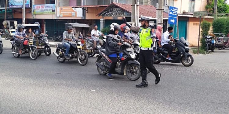 LHOKSEUMAWE – Cegah kemacetan jelang berbuka puasa, Polantas Lhokseumawe melakukan strong poin atau pengaturan lalu lintas di sejumlah titik di Kota Lhokseumawe, Kamis (23/3/2023) sore.
