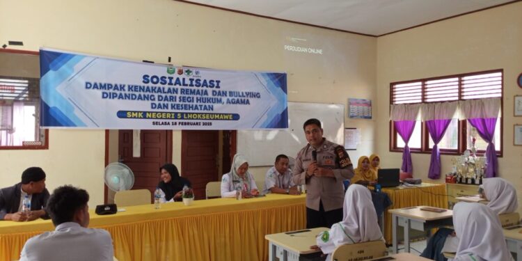 Lhokseumawe – Guna meningkatkan kesadaran siswa terhadap bahaya kenakalan remaja dan bullying, Polsek Blang Mangat bersama instansi terkait menggelar sosialisasi di SMKN 5 Lhokseumawe, Selasa (18/2/2025).
