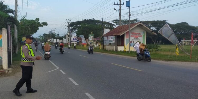 Aceh Utara – Personil Polsek Blang Mangat Polres Lhokseumawe Polda Aceh laksanakan kegiatan strong point dengan melakukan pengaturan lalu lintas di seluruh titik rawan laka lantas, rawan kemacetan, pada jam sibuk serta lokasi persekolahan. Strong point ini digelar di lingkungan sekitar perkantoran dan pintu masuk sekolah yang berada di wilayah Hukum Polsek Blang Mangat (07/05/2024) pagi
