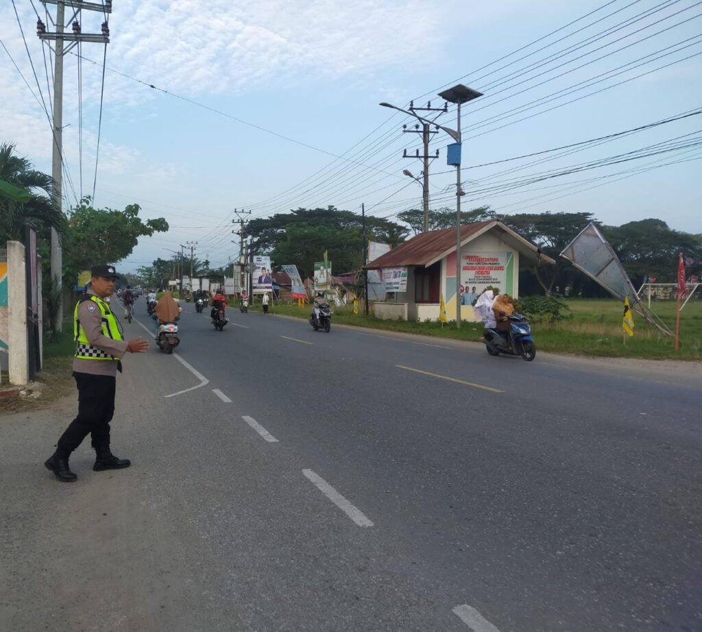 Aceh Utara – Personil Polsek Blang Mangat Polres Lhokseumawe Polda Aceh laksanakan kegiatan strong point dengan melakukan pengaturan lalu lintas di seluruh titik rawan laka lantas, rawan kemacetan, pada jam sibuk serta lokasi persekolahan. Strong point ini digelar di lingkungan sekitar perkantoran dan pintu masuk sekolah yang berada di wilayah Hukum Polsek Blang Mangat (07/05/2024) pagi