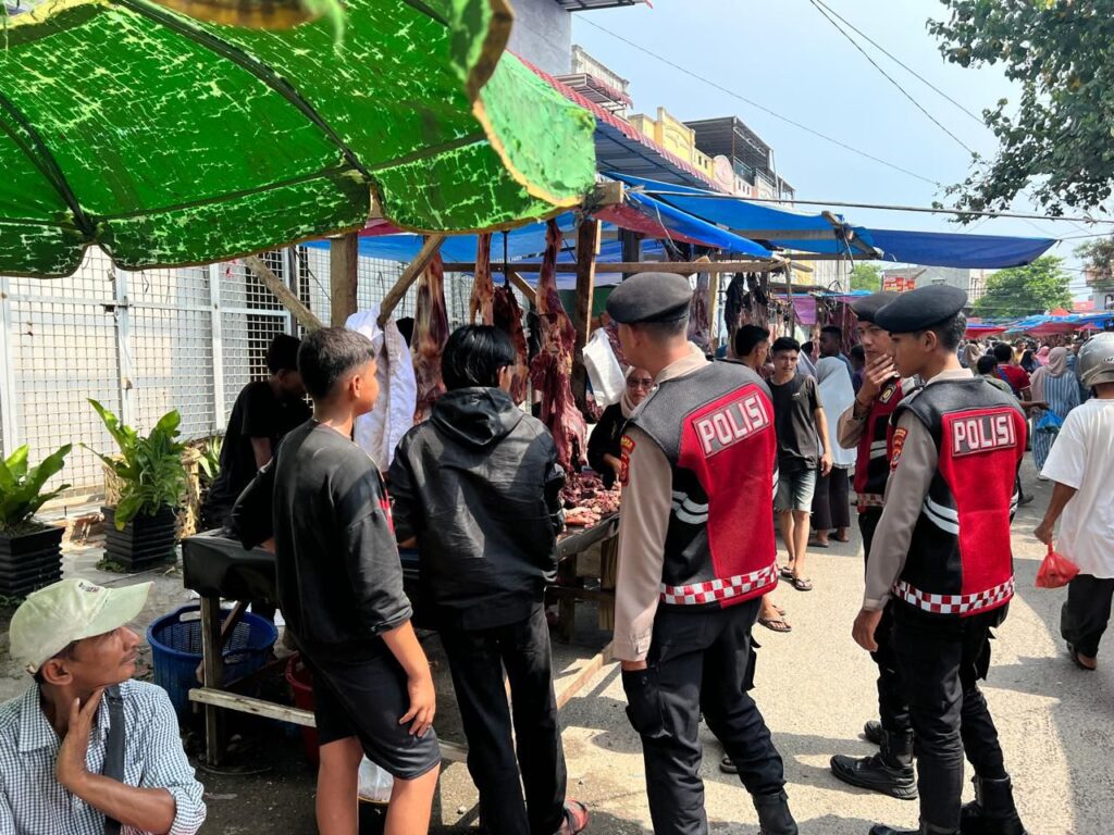 Lhokseumawe – Menjelang Hari Raya Idul Adha 1446 H, Polres Lhokseumawe melalui personel Satsamapta meningkatkan patroli dan pengamanan di pasar tradisional, khususnya lokasi penjualan daging meugang, Kamis (5/6/2025).
