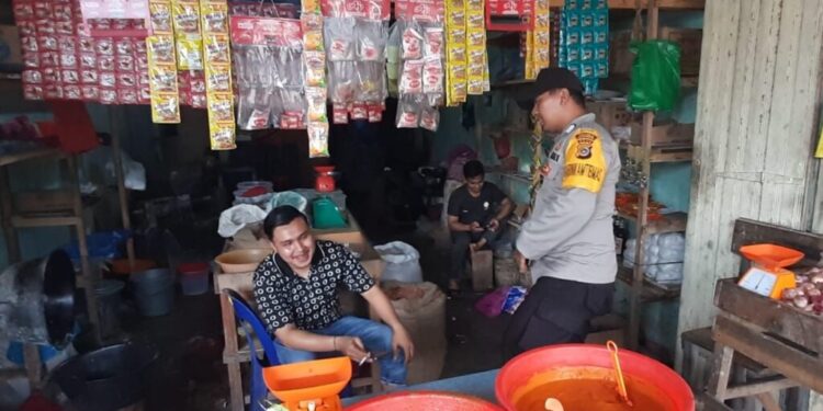 LHOKSEUMAWE – Dua Personel Polsek Simpang Keuramat turun ke pasar tradisional dan toko kelontong di Kecamatan Simpang Keuramat, Aceh Utara, wilayah hukum Polres Lhokseumawe untuk mengecek stok sembako, Rabu (8/2/2023).