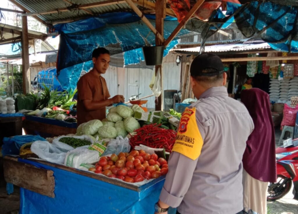 LHOKSEUMAWE – Personel Polsek Samudera menyambagi pedagang di pasar tradisional dan toko kelontong untuk mengecek stok sembako menjelang bulan suci Ramadhan di wilayah Kecamatan Samudera, Sabtu (18/3/2023).