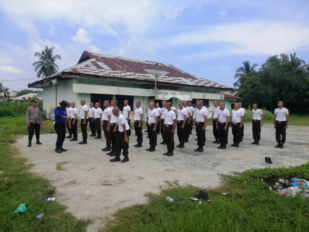 LHOKSEUMAWE – Personel Sat Binmas Polres Lhokseumawe memberikan pelatihan tentang baris berbaris pada kegiatan pendidikan dasar (Diksar) Satpam Gada Pratama Angkatan XXV 2024 di BKPSDM Aceh Utara di Lhokseumawe, Minggu (21/1/2024).