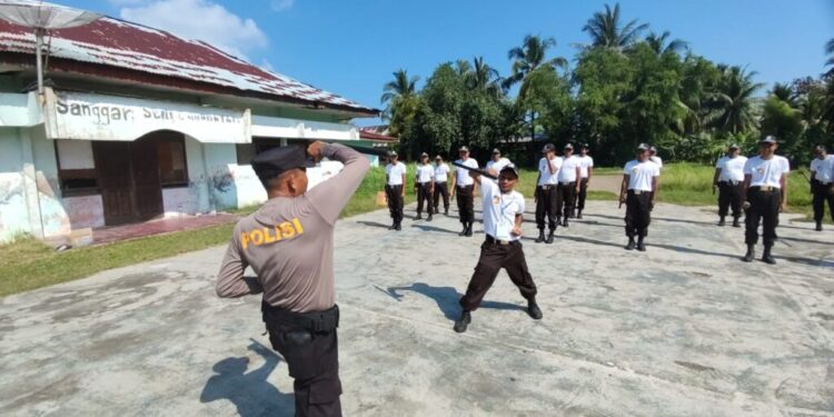LHOKSEUMAWE – Personel Sat Binmas Polres Lhokseumawe memberikan pelatihan tentang teknik menggunakan borgol dan tongkat Polri (Bortopol) kepada calon Satpam di gedung BKPSDM Aceh Utara di Lhokseumawe, Senin (22/1/2024).