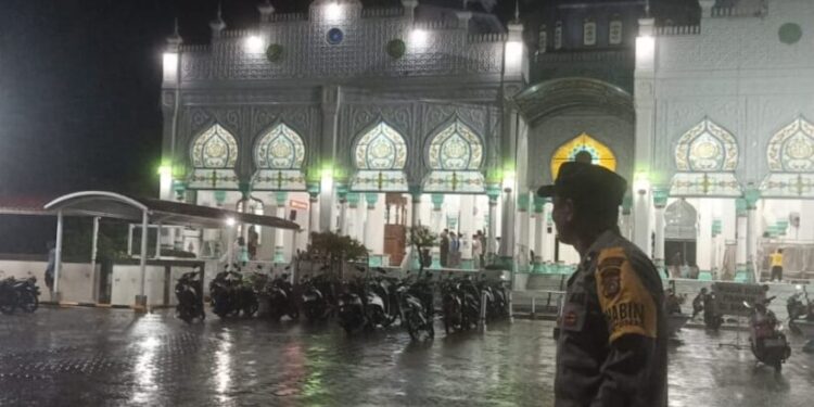 Meskipun cuaca kurang bersahabat, jamaah tetap antusias melaksanakan shalat tarawih. Kehadiran polisi pun memberikan rasa aman bagi para jemaah yang khusyuk beribadah.
