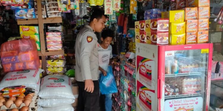 LHOKSEUMAWE – Dua personel Polsek Simpang Keuramat mengecek stok sembako di pasar Keude Simpang Empat, Simpang Keuramat, Aceh Utara, wilayah hukum Polres Lhokseumawe, Selasa (28/2/2023).